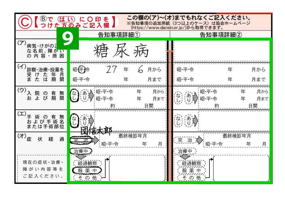また、いずれかで「はい」とお答えいただいた場合は、右欄Ⓒに進み、病名等や治療・投薬、入院、手術、症状経過等(ア)~(オ)すべての項目に詳しくご記入ください。